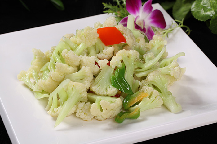 2.炒鍋放少許油,放入蒜末炒香,下入焯好水的菜花,咸鮮粉。